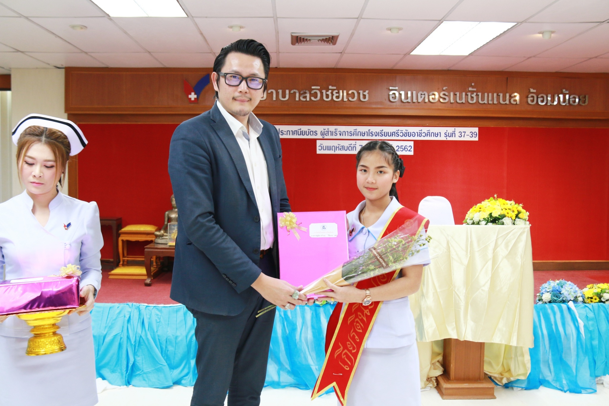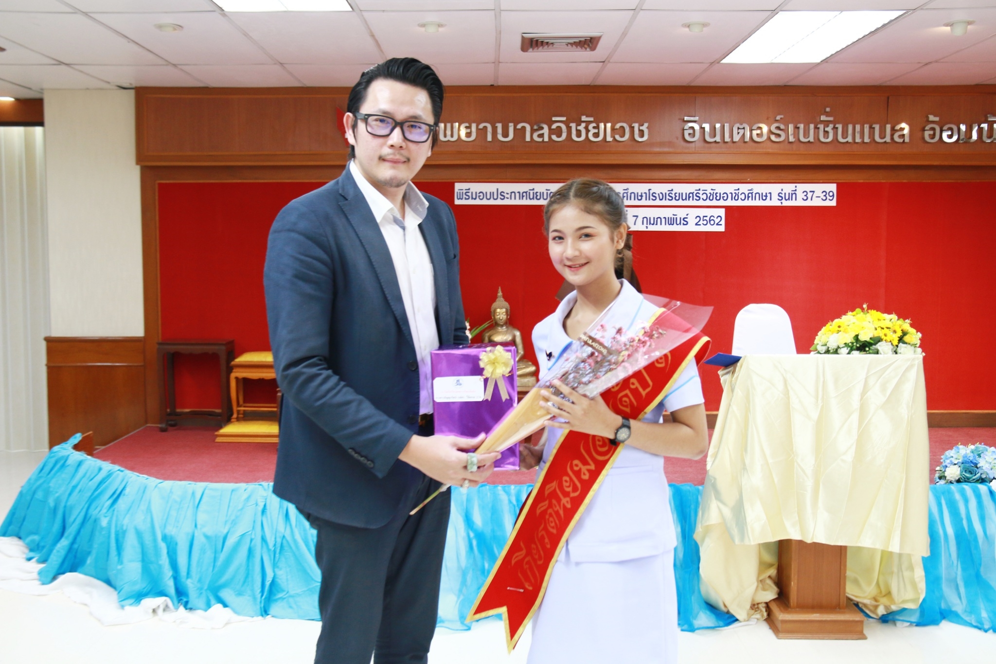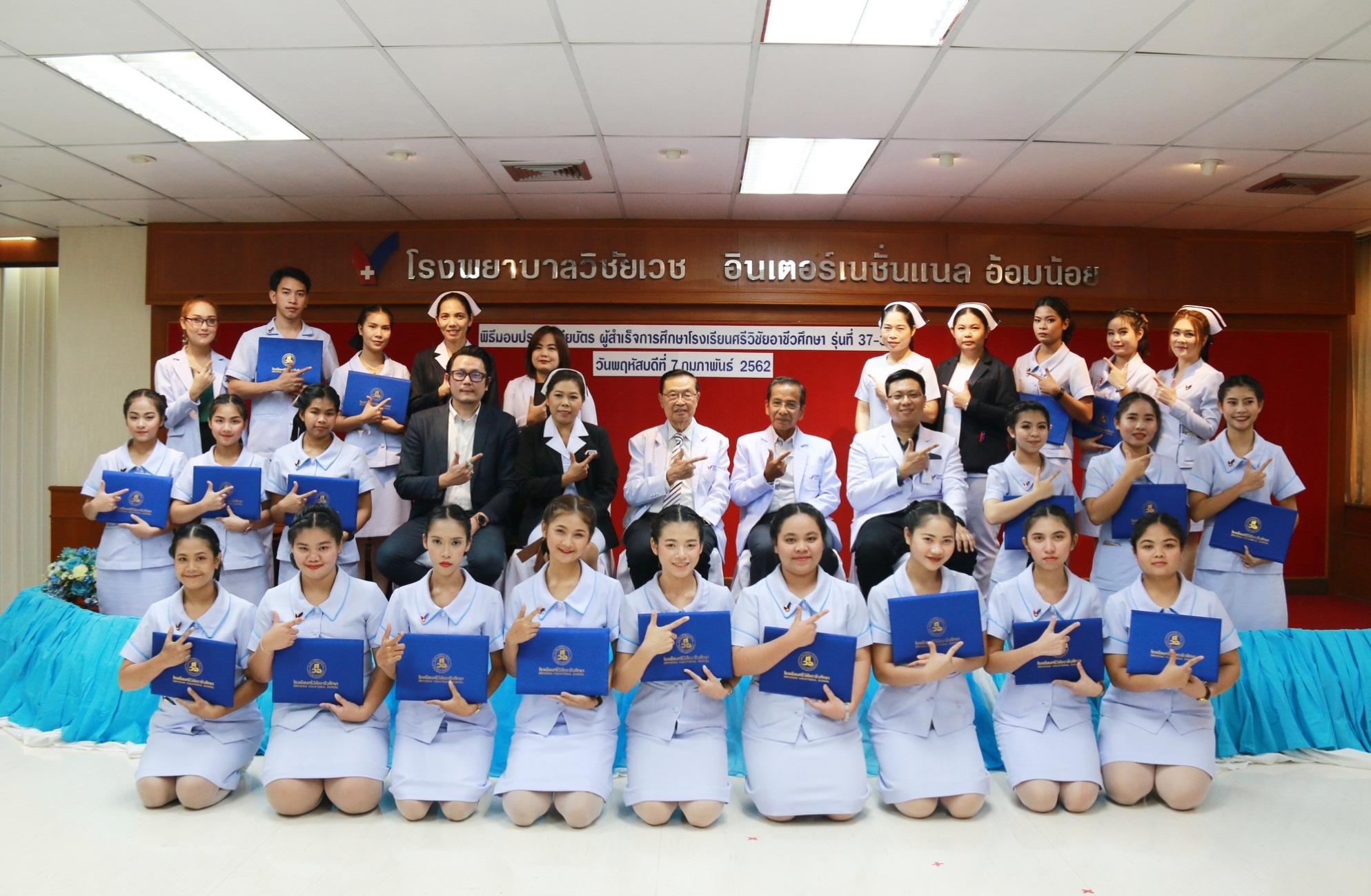 นพ.พงษ์ศักดิ์ วัฒนา ประธานกรรมการบริหารโรงเรียนศรีวิชัยอาชีวศึกษา เป็นประธานในพิธีมอบประกาศนียบัตรแก่ผู้สำเร็จการศึกษา หลักสูตรการดูแลเด็กเล็กและผู้สูงอายุ [ NA] รุ่นที่ 37, 38 และ 39 ในวันที่ 7 กุมภาพันธ์ 2562 ณ ห้องประชุมขวัญเมือง อาคาร 1 ชั้น 7 โรงพยาบาลวิชัยเวช อินเตอร์เนชันแนล อ้อมน้อย จ.สมุทรสาคร